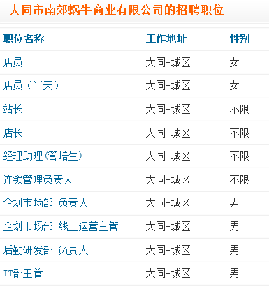 您當前的位置:大同人才網(wǎng) >> 大同人才網(wǎng)資訊 >> 招聘公告 >> 大同市南郊蝸牛商業(yè)有限公司